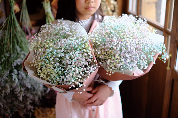 オリジナルカラーのかすみ草で花束を作り、花瓶にセットしてテーブルへコーディネートします。