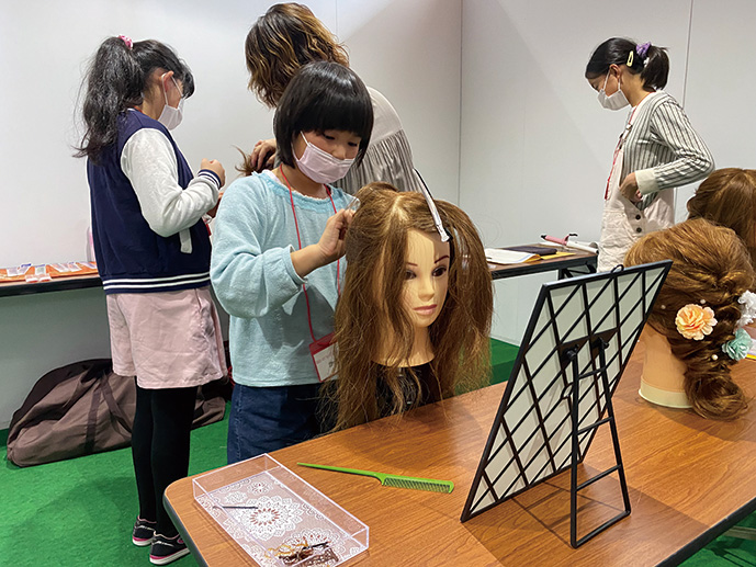 ウイッグを使って様々なヘアーアレンジを行い、要望にあわせたアレンジがあることを学びます。