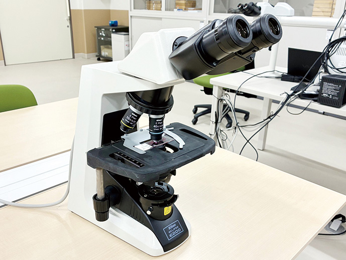 細胞を染色してプレパラートを作り、顕微鏡で観察する工程を体験します。